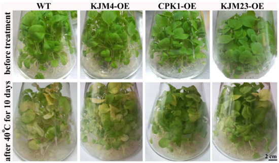 In the present study, we performed a detailed analysis of the heat tolerance of AtCPK1-KJM23 tobacco plants growing in vitro. Control WT plants and plants transformed with native and modified forms of the AtCPK1 gene were grown in vitro on MS media under control conditions (24 °C) for 30 days, followed by moderate heat exposure (40 °C) for 10 days (Figure 1). Heat treatment caused leaf yellowing, which is associated with stress-induced senescence. As shown in Figure 1, the degree of yellowing of the leaves was significantly lower for KJM23-OE plants than for WT, KJM4-OE, and CPK1-OE plants (Figure 1).