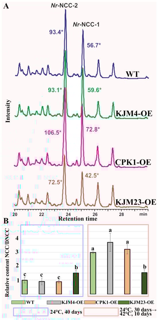 Heat-induced accumulation of NCC/DNCC chlorophyll catabolites in N. tabacum plants HPLC separation (A) and UV determination of chlorophyll catabolites from N. tabacum plant extracts. Chromatograms were recorded at 312 nm and are presented with an overlay and on the same scale. The coloured asterisks (*) indicate the peak areas of the studied compounds. NCC/DNCC (B) relative content in extracts of 40-day-old tobacco plants grown in vitro under unstressed conditions (24 °C, blue frame) and after heat treatment at 40 °C for 10 days (pink frame): native (CPK1-OE), mutant inactive (KJM4-OE), and constitutively active (KJM23-OE) forms of the AtCPK1 gene-transformed plants and control plants (WT). Three separate experiments provided the results, which are shown as mean ± standard error of the mean. Statistically significant differences are indicated by the various letters above the error bars (p < 0.05, Fisher’s LSD).