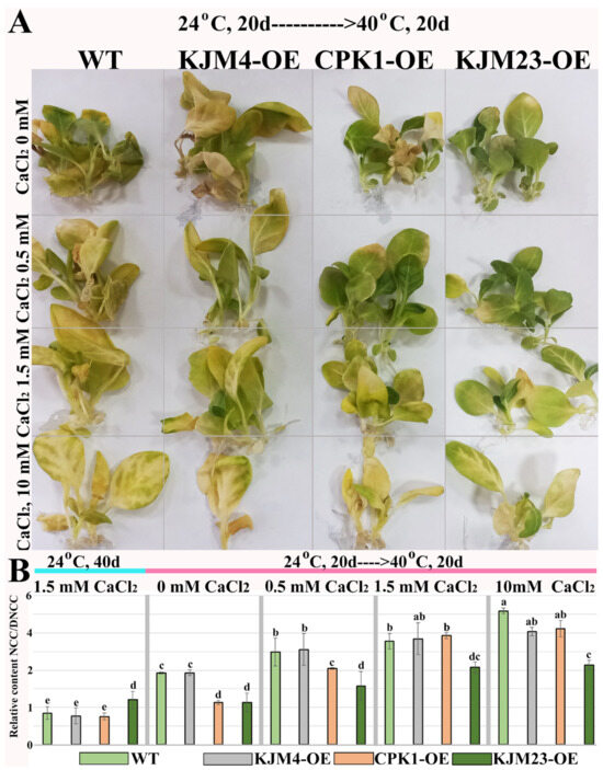 Untransformed WT and transgenic tobacco plants were grown in vitro for 20 days under control conditions (24 °C). To determine the effect of calcium supplementation, plants were grown on media supplemented with 0, 1.5, or 10 mM CaCl2. Twenty-day-old plants were exposed to moderate heat stress at 40 °C for 20 days. As shown in Figure 3A, Ca2+-free conditions prevented heat-induced damage to chlorophyll in heat-treated WT and KJM4-OE plants, while a negative effect of Ca2+ supplementation was observed.