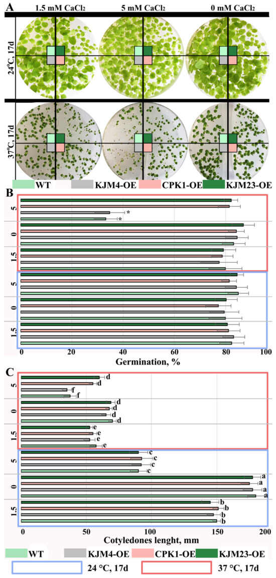 Next, we studied the effects of slight heat treatment and calcium supplementation on the germination (Figure 4) of WT and plants transformed with native and modified AtCPK1 gene seeds. The seeds were sterilely germinated for 17 days in MS media supplemented with 0, 1.5, or 5 mM CaCl2 under control conditions (24 °C) or heat treatment (37 °C). A low concentration of CaCl2 and heat did not affect the percentage of germinated seeds; for all treated variants of tobacco plants, the percentage was approximately 80% (Figure 4A,B). These findings indicate the absence of a considerable inhibitory effect of slight heating on the process of germination. A decrease in germination was observed only for WT and KJM4 when the CaCl2 concentration was increased to 5 mM, whereas the germination of CPK1-OE and KJM23-OE seeds was not affected. However, the lengths of the seedlings was significantly shorter those that of the control group (Figure 4A,C). The reduction was approximately 4-fold under the combined effect of temperature and calcium, 3-fold under the effect of temperature alone, 2-fold under the effect of the highest calcium concentration, and 1.3-fold under a calcium concentration of 1.5 mM. This finding pointed to the stage-dependent action of recombinant AtCPK1. At the early stage of growth, we did not detect any differences between the native and modified constitutively active forms of the AtCPK1 gene.
