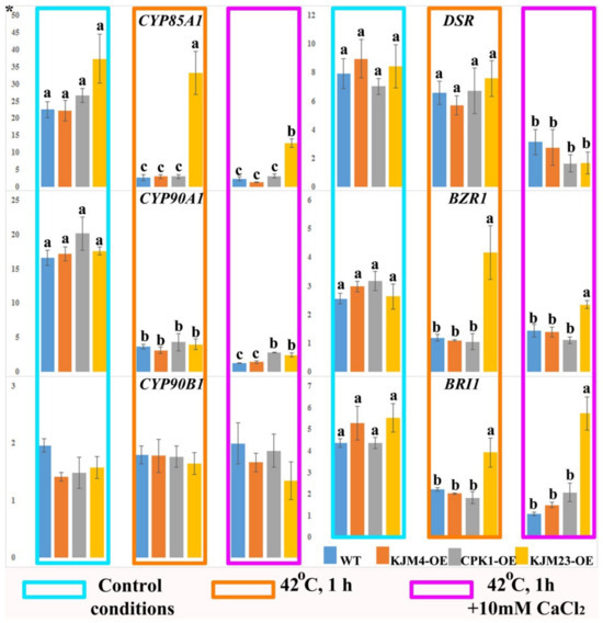 Expression of the BR biosynthesis (NtCYPs and NtDSR) and signalling (NtBZR1 and NtBR1) genes in N. tabacum plants after heat shock treatment with or without CaCl2. Forty-day-old control (WT), transformed native (CPK1-OE), mutant inactive (KJM4-OE), and constitutively active (KJM23-OE) forms of the AtCPK1 gene were subjected to temperature stress (42 °C) for 1 h with supplementation of 10 mM calcium chloride for one group. Three independent experiments (biological replicates) were used for each stress treatment, and three technical replicates were used for qPCR measurements of each biological replication. The values were computed from the qPCR data using the 2−ΔΔCt technique. The asterisks above the vertical axis denote the relative expression level. Fisher’s LSD and statistically significant differences (p < 0.05) are indicated by the various letters above the error bars.
