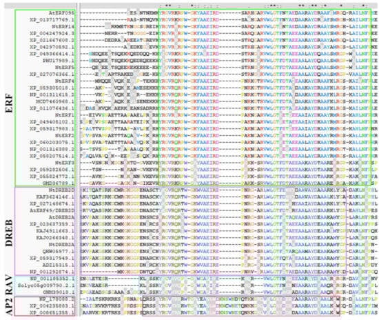 The alignment of amino acid (a.a.) sequences of AP2 family members of N. tabacum. NtERFs (NtERF1-5, NtERF14), homologues of A. thaliana DREB2A, DREB2D, ERF96, and homologues from other plants were divided into subfamilies (ERF, DREB, RAV, and AP2) and highlighted in green, pink, blue, and red blocks, respectively. The conserved single AP2 domains in ERFs and the DREB and RAV subfamilies are highlighted in green, pink, and blue blocks, respectively. The first conserved AP2 domain in the AP2 subfamily is highlighted with a red block. The AP2 family is divided into subfamilies (ERF, DREB, RAV, and AP2), and conserved domains are defined according to [31]. The amino acid (a.a.) sequences were aligned via ClusatlX, and the amino acid (a.a.) sequences with GenBank IDs are listed in Supplementary Section S1. The dashes, asterisk, dot, and colon indicate gaps, identical amino acid residues, semi-conserved and conserved substitution in all sequences used in the alignment respectively.