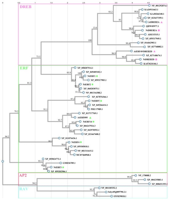 Using the ClustalW online tool, a phylogenetic tree was constructed on the basis of the alignment of amino acid sequences performed via ClustalX. As shown in Figure 7, NtERFs (NtERF1-5, NtERF14), homologues of A. thaliana DREB2A, DREB2D, ERF96, and homologues from other plants were divided into subfamilies (ERF, DREB, RAV, and AP2) and highlighted in green, pink, blue, and red blocks, respectively. The AP2 family members of N. tabacum and A. thaliana are designated with dots and triangles, respectively, and the colours correspond to the subfamily groups. As shown in Figure 7, NtERF1-5 and NtERF14 belong to the ERF subfamily, as well as AtERF096, and NtERF14 is closer to AtERF096 than the other analysed NtERFs are. NtDREB2A and NtDREB2D divided and clustered together with AtDREB2A and AtDREB2, respectively.