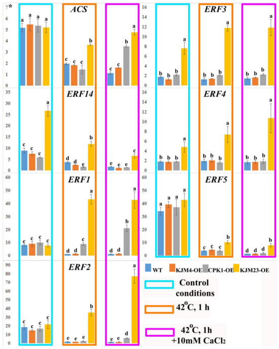 Expression of the ethylene biosynthesis (NtACS) and signalling (NtERFs) genes in N. tabacum plants after heat shock treatment with or without CaCl2. Forty-day-old, in vitro-grown control (WT), transformed native (CPK1-OE), mutant inactive (KJM4-OE), and constitutively active (KJM23-OE) forms of the AtCPK1 gene were subjected to temperature stress (42 °C) for 1 h with supplementation of 10 mM calcium chloride for one group. Three independent experiments (biological replicates) were used for each stress treatment, and three technical replicates were used for qPCR measurements of each biological replication. The values were computed from the qPCR data using the 2−ΔΔCt technique. The asterisks above the vertical axis denote the relative expression level. Fisher’s LSD and statistically significant differences (p < 0.05) are indicated by the various letters above the error bars.