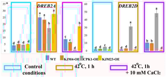 Expression of the NtDREB genes in N. tabacum plants after heat shock treatment. 40-day-old, in vitro-grown control (WT), transformed native (CPK1-OE), mutant inactive (KJM4-OE), and constitutively active (KJM23-OE) forms of the AtCPK1 gene were subjected to temperature stress (42 °C) for 1 h with the addition of 10 mM calcium chloride for one group. Three independent experiments (biological replicates) were used for each stress treatment, and three technical replicates were used for qPCR measurements of each biological replication. The values were computed from the qPCR data using the 2−ΔΔCt technique. The asterisks above the vertical axis denote the relative expression level. Fisher’s LSD and statistically significant differences (p < 0.05) are indicated by the various letters above the error bars.