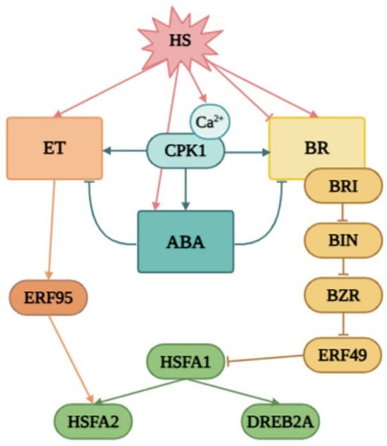 Since 1998, BRs have been considered class 6 plant hormones. BRs are involved in the regulation of plant growth, development, and stress tolerance. Modulation of endogenous BRs can increase crop yield and quality as well as improve crop stress tolerance [6]. BRs are structurally similar to animal steroids [7]. BRs interact with other hormones to regulate adaptation to abiotic stresses. The BR receptor (BRASSINOSTEROID INSENSITIVE 1, BRI1) recognises the BR signal through the extracellular domain. Activated BRI1 transmits BR signals to protein signalling kinases (BSKs), which leads to BIN2 dephosphorylation. BIN2 is restrained by KIB1 (KIK SUPPRESSED IN BZR1-1D), which prevents the association of BINs with BZR1/BES1 and facilitates its ubiquitination [8]. BZR1/BES1 is dephosphorylated by PP2A (PHOSPHATASE 2A) and enters the nucleus. In this way, the regulatory role of BRs, in regulating the processes of growth, development, and resistance to osmotic and temperature stress, is realised. However, while the molecular mechanism by which BRs are involved in the regulation of the response to osmotic stress and cold is known, the role of BRs in heat stress remains to be elucidated. BR may be inhibited under heat stress, leading to the accumulation and activation of BIN2, which leads to the activation of ERF49 (DREB2D) expression [9]. In another work, the authors proposed that BR is induced by heat stress, leading to the activation of BZR1, which represses ERF49 expression. Arabidopsis HSFA1s function as “master regulators” and are induced under heat stress to directly regulate the expression of downstream HEAT STRESS RESPONSIVE (HSR) genes, or indirectly, through activation of the AP2/ERF TF DREB2A [10]. The expression of ERF95 or ERF97 enhances basal thermotolerance in Arabidopsis [11].