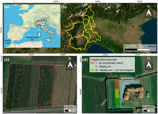 Localization of the study site: (a) map of Italy (red cross: experimental orchard location); (b) map of Piedmont (red cross: experimental orchard location); (c) a KiDS-affected orchard (red box) located nearby the experimental orchard: wide failures are evidence of uprooting following plant death due to KiDS; (d) experimental orchard.
