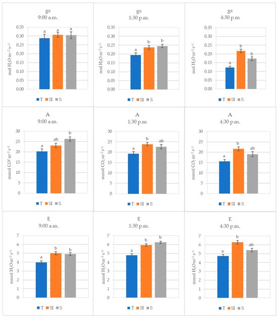 Stomatal conductance (gs, mol H2O m−2 s−1), net CO2 assimilation (A, µmol CO2 m−2 s−1), and transpiration (E, mmol H2O m−2 s−1) of T, SI, and S treatments measured in 2022 at three different times of the day (morning, midday, and afternoon). Data shown are the mean values ± standard error of detections from three leaves of four plants in three different measurements (DOY 209, 215, and 221); different letters show significant differences between the treatments according to ANOVA and least significant difference (LSD) analyses at a p-value threshold of ≤0.05.