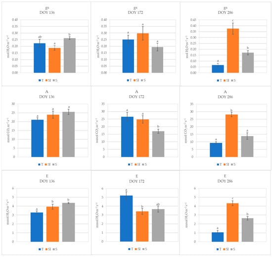 Stomatal conductance (gs, mol H2O m−2 s−1), net CO2 assimilation (A, µmol CO2 m−2 s−1), and transpiration (E, mmol H2O m−2 s−1) of T, SI, and S treatments measured in 2023 at three different times (DOY 136, 172, and 286). Data shown are the mean values ± standard error of detections from three leaves of four plants; different letters show significant differences between the treatments according to ANOVA and least significant difference (LSD) analyses at a p-value threshold of ≤0.05.