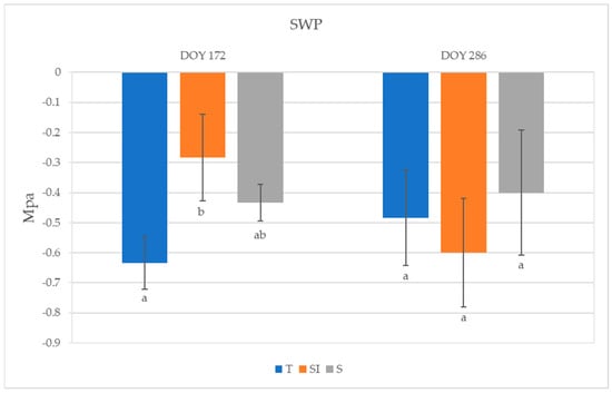 The highest SWP was observed in SI plants (−0.28 MPa) and the lowest was observed in T plants (−0.63 MPa) at DOY 172; a significant difference was detected between plants undergoing T and SI treatments (Figure 4). An SWP increase was observed from DOY 172 to DOY 286 in T and S plants, while it decreased in SI. No significant differences among treatments were detected on DOY 286.