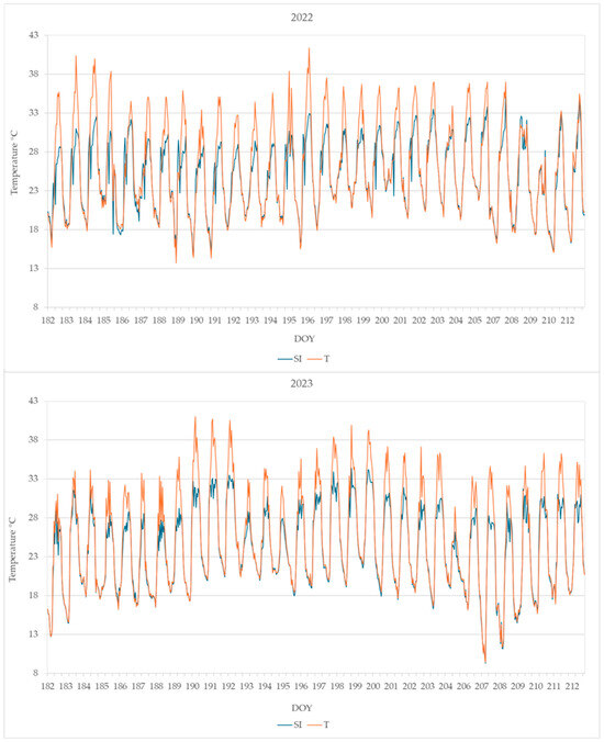 The highest leaf temperatures reached during the summer months (June, July, and August) are reported in Table 2. Very high temperatures were reached in treatment T, higher than 40 °C in both years 2022 and 2023, while in treatment SI, the highest leaf temperature was 35.1 °C in 2022 and 35.9 °C in 2023.