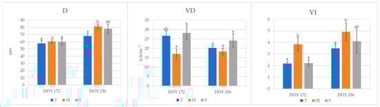Roots xylem vessel characterization of plants from T, SI, and S treatments, carried out on samples collected in 2023 at DOY 172 and 286. Data shown are the mean values ± standard error of data detected from 8 plants per treatment; different letters show significant differences between the treatments according to ANOVA and least significant difference (LSD) analyses at a p-value threshold of ≤0.05. D = vessel diameter (μm); VD = vessel density (n mm−2); VI = vulnerability index to cavitation.