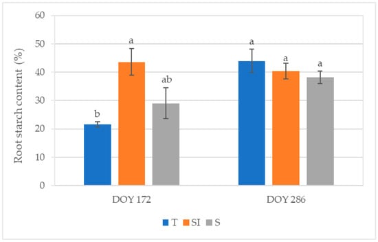 Root starch content expressed as a percentage of the Lugol-stained area of the total root sample area detected by light microscopy in root sections from samples collected at DOY 172 and DOY 286 from T, SI, and S treatments. Data shown are the mean values ± standard error of data detected from 8 plants per treatment; different letters show significant differences between the treatments according to ANOVA and least significant difference (LSD) analyses at a p-value threshold of ≤0.05.