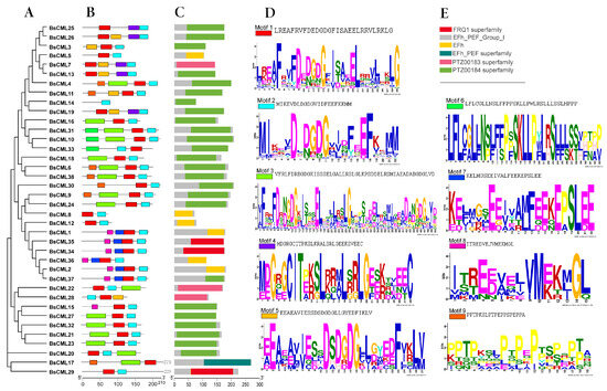 Phylogenetic and structural analysis of BsCML proteins. (A) Phylogenetic tree of the BsCML family. (B) Motif analysis of BsCML proteins. (C) Prediction of conserved domains (CDs) in BsCML proteins. (D) Sequence logos corresponding to panel (B), where the height of each letter represents the bit score of the respective amino acid, with higher bit scores indicating greater conservation. (E) Six predicted structural motifs identified in panel (C).