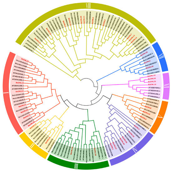 Phylogenetic relationships of BsCML with CML families from A. thaliana (At), D. catenatum (Dc), and P. equestris (Pe). Members of the BsCML family are highlighted in red and distributed across subfamilies I–VIII, with each subfamily denoted by a distinct color.