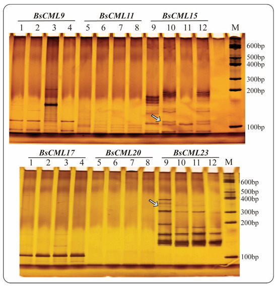 Seven sequences containing SSR loci were identified in 38 BsCML members, of which three sequences were dinucleotide repeats and four sequences were trinucleotide repeats, with repeat numbers ranging from a minimum of 3 to a maximum of 11 (Table 2). The SSR frequency (i.e., the ratio of the number of unigenes containing SSRs to the total number of unigenes) of BsCML in B. striata was 18.42%. The results of PAGE detection of SSR molecular markers (Figure 3) showed that BsCML could stably amplify bands, and it was observed that BsCML11, BsCML15, and BsCML23 exhibited different banding patterns among different strains of B. striata. Additionally, multiple allele bands were isolated for BsCML15 and BsCML23. These results indicate that BsCML in B. striata exhibits polymorphism at SSR loci, potentially playing an important role in the identification of different B. striata germplasm resources.