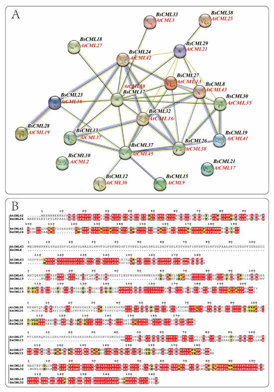 During plant growth and metabolism, regulation often involves multiple genes. The regulatory proteins or biocatalytic enzymes encoded by these genes play synergistic or antagonistic roles to ensure normal organismal development. The function and interactions of BsCML proteins were preliminarily examined by comparison with the CML genome proteins of the model plant A. thaliana. From the BsCML protein–protein interaction (PPI) network (Figure 5A), it was observed that BsCML32, BsCML24, BsCML23, BsCML28, BsCML13, BsCML37, BsCML26, BsCML19, BsCML18, and BsCML30 exhibit close relationships, with BsCML32 at the core. These results suggest a potential close interaction among BsCML genes.