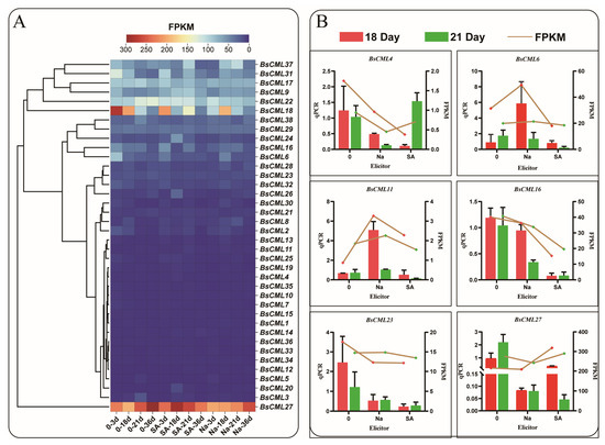 To explore the expression differences in BsCML family genes at different growth stages and under elicitor treatments, the expression levels of BsCML family genes in B. striata were analyzed using transcriptomic FPKM values to generate a heatmap. The results indicated that the expression of the BsCML gene family was generally silenced or exhibited a low response to SA and NaAc treatments (Figure 6A). Among these genes, the expression levels of BsCML1-5, BsCML7-8, BsCML10-15, BsCML19-21, BsCML25-26, BsCML30, and BsCML32-36 were relatively low (FPKM < 150), whereas BsCML27 showed high expression at various developmental stages. It is speculated that BsCML27 is involved in the growth and development of B. striata callus. These findings suggest that the BsCML family is in a low-response state during B. striata callus culture and that specific BsCML members may play roles in the growth and development of B. striata cell suspensions. To verify the reliability of the transcriptome data, six genes were randomly selected for validation, with the β-actin gene used as a reference control (Figure 6B). The results showed that, among the six randomly selected genes, the expression trends of five genes were largely consistent between FPKM and qPCR data. However, an inconsistency was observed in the expression trend of BsCML27. For example, at 18 days, the FPKM expression pattern of BsCML27 was SA > control > NaAc, whereas the qPCR pattern was control > SA > NaAc. Overall, the qPCR validation results confirm the reliability of the transcriptomic FPKM data.