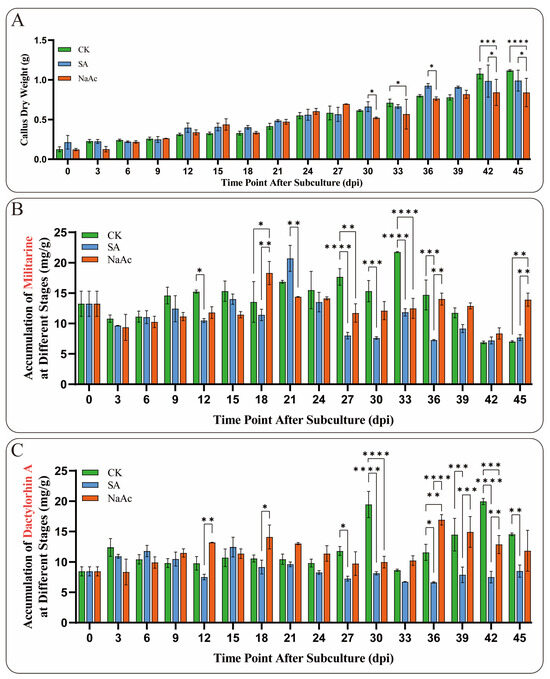 Growth and metabolite accumulation of B. striata callus treated with 15 μmol/L SA and 150 μmol/L NaAc. (A) Dry weight growth trend of B. striata callus cells in the elicitor and control (CK) groups from 0 to 45 dpi. (B) Changes in the accumulation of militarine in the induced callus. (C) Changes in the accumulation of Dactylorhin A in the callus treated with induction. Asterisks denote significance levels: * p < 0.05, ** p < 0.01, *** p < 0.001, **** p < 0.0001 (one-way ANOVA).