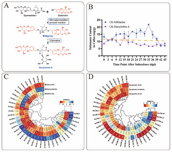 Correlation of BsCML expression with accumulations of militarine and dactylorhin A. (A) Relationship between militarine, gastrodin, and dactylorhin A. (B) The accumulation trend of militarine and the derivative dactylorhin A in the 0–45 dpi control group, with the dotted line representing the virtual symmetry axis. (C) Correlation heatmap of BsCML expression in B. striata callus and militarine synthesis. (D) Correlation Heatmap of BsCML expression in B.striata callus and dactylorhin A synthesis.