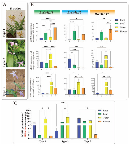 To investigate the regulatory roles of BsCML11, BsCML32, and BsCML37 in militarine biosynthesis, their expression patterns were analyzed in the roots, tubers, flowers, and leaves of three B. striata varieties with distinct phenotypes (Figure 9A). The results revealed significant tissue-specific expression patterns for all three genes (Figure 9B). Notably, the expression levels of BsCML11 and BsCML37 in tubers followed the order type3 > type2 > type1, with significantly higher expression in the tubers of purple-flowered varieties (type2 and type3) compared to other tissues (p < 0.01 or p < 0.0001). Since tubers are the primary medicinal part of B. striata, the high expression of BsCML11 and BsCML37 may contribute to the superior medicinal value of purple-flowered varieties over yellow-flowered ones. Additionally, BsCML11 and BsCML37 exhibited similar expression trends and levels across the three B. striata varieties, suggesting that their functions may be conserved or involved in essential plant metabolic processes. For example, BsCML11 and BsCML37 showed extremely low expression in type2 flowers but significantly higher expression in the tubers of type2 and type3 compared to type1, which may correlate with differences in flower color and medicinal efficacy. In contrast, the expression of BsCML32 in the tubers and roots of type1 was significantly lower than in type3, implying its potential role in the differential metabolite accumulation between these varieties. These findings underscore the diversity of BsCML expression patterns and their tissue-specific variations, suggesting their regulatory roles in the accumulation and metabolic processes of B. striata.