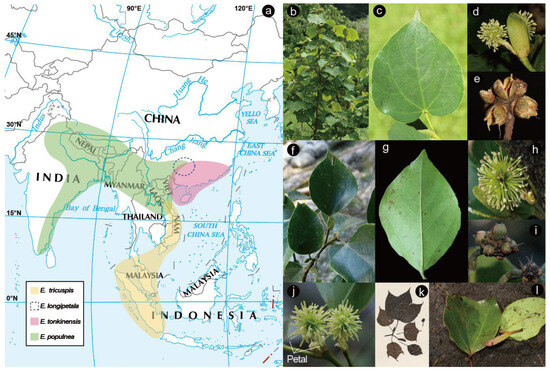 Distributions and morphological diversity of genus Exbucklandia. (a) Map of distributions based on the global specimens’ records; (b–e) E. populnea; (f–i) E. tonkinensis; (j) E. longipetala; (k,l) E. tricuspis.