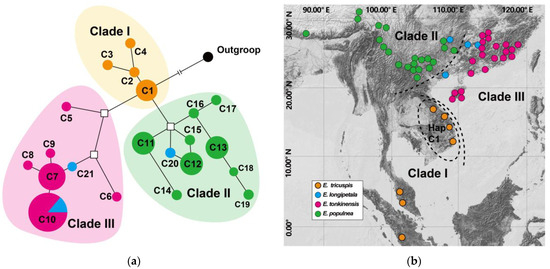 Four chloroplast fragments (trnS–psbZ, trnG–trnfM–rps14, trnV, and rpl32) were successfully amplified in 56 of 59 populations (eight individuals of each population) of all four Exbucklandia species. After alignment and trimming, the combined-sequence length was 2345 bp without gaps. The combined dataset, incorporating outgroup sequences (Rhodoleia championii Hook. f.), was trimmed to 2401 bp and employed for haplotype network reconstruction. Each population was detected to have only one chloroplast haplotype, and a total of twenty-one haplotypes were detected, with 25 single-nucleotide variants (SNVs) (Tables S1 and S2). Haplotype network analysis (Figure 2a) showed that four haplotypes were detected in E. tricuspis forming Clade I, nine unique haplotypes in E. populnea forming Clade II, and six haplotypes in E. tonkinensis forming Clade III. For E. longipetal, three haplotypes were observed across the four populations sampled: one haplotype was grouped in Clade II and two in Clade III. The geographical distribution of these haplotypes (Figure 2b) indicated distinct patterns: Clade I was located in Southern Asia, Clade II was present in Southwest China, and Clade III was found in Southeast China. Notably, haplotype C1, which was positioned centrally in the haplotype network, was recorded in the four populations sampled from Vietnam.