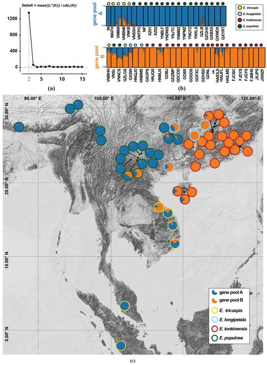 The structure analysis conducted on the 50 populations of Exbucklandia revealed that the optimal ΔK value was two (Figure 3a). The populations were divided into two distinct genetic pools (Figure 3b,c): E. populnea was derived mostly from gene pool A, while E. tonkinensis harbored mostly gene pool B. In areas bordering the distribution of these species, such as in Northern Vietnam and Southern China, populations exhibited an admixture of these two gene pools. For the four populations of E. longipetala, the two located near E. populnea (GZLGS and GXSW) showed an admixture of the two gene pools, while the other two populations near E. tonkinensis in Hunan province were derived mostly from pool B, as were most of the E. tonkinensis populations. For E. tricuspis, the two populations in Malaysia–Indonesia region were predominantly assigned to pool A components; all four populations in Vietnam exhibited an admixture of pools A and B, with three dominated by pool A and one showing a higher proportion derived from pool B.