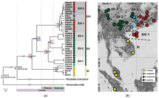 Mature capsules of Exbucklandia exhibit rapid curling and eject seeds ballistically over short distances during dehiscence under mechanical pressure. This dispersal mechanism with limited seed dispersal distance provides a slow seed dispersal (compared to pollen dispersal) in many tree populations, as observed in Juglans [53], Populus [54], and Quercus [55]. Consequently, the plastid lineage mediated directly by seed dispersal could provide valuable insights into the origin and dispersal of Exbucklandia. Plastid network analysis revealed that haplotype C1 occupies a central position, connecting Clade I, Clade II, and Clade III, as well as the outgroup, suggesting that it may represent the most ancient haplotype. By integrating the geographical distribution of these haplotypes with divergence time estimates, we propose that the extant Exbucklandia species originated from E. tricuspis in tropical Vietnam, where haplotype C1 occurred. Subsequently, this species spread northward to subtropical China approximately 7 MA, leading to the formation of E. populnea in the western region and E. tonkinensis in the eastern region. Within E. populnea, the plastid tree indicates that subclade EII-1 diverged from its sister subclades EII-2 and EII-3 approximately 3.67 MA (Figure 4a). Geographically, subclades EII-1, EII-2, and EII-3 are distributed in the eastern, central, and western regions of the species’ range, respectively (Figure 4b). These findings support the hypothesis that E. populnea originated in the eastern provinces of Guizhou and Guangxi, subsequently spreading to the western province of Yunnan around 3–4 MA. Within E. tonkinensis, subclade EIII-1 includes four samples collected from coastal areas of Southeast China, whereas subclade EIII-2 comprises samples from inland areas. This phylogeographic pattern suggests that E. tonkinensis originated in Hainan and the coastal areas of Guangdong, later spreading northward into inland regions. For E. tricuspis, the plastid network reveals that haplotypes C2–C4 are derived from C1, indicating that E. tricuspis spread from Vietnam to southern Malaysia. In summary, the extant Exbucklandia originated from Vietnam, with E. tricuspis represents the most ancestral lineage. It migrated northward to subtropical China ~7 MA, where it diverged into two species: E. populnea, which spread further northward to Guangxi and Guizhou provinces, and E. tonkinensis, which spread eastward to Hainan and coastal Guangdong. In addition, E. populnea expanded westward to Yunnan, diverging into subclades EII-1, EII-2, and EII-3. By approximately 1 MA, E. tonkinensis had spread northward to the inland areas of Guangdong and neighboring regions, while E. tricuspis moved southward to Malaysia. The northward migration of Exbucklandia from tropical Vietnam to subtropical China, estimated to occur ~7 MA, coincides with the intensification of the East Asian monsoon (EAM) during the 7–99 MA period [56]. This supports the hypothesis that the establishment and intensification of the EAM significantly altered the climate of subtropical China, creating conditions conducive to the habitation of various plant species [14,57,58].
