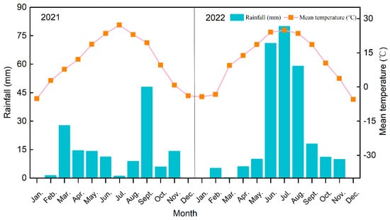 The field trial was carried out from April 2021 to October 2022. The plot area for each treatment was 50 m2 (10 m × 5 m), and the planting density was 71,500 ha−1. During the study period, 60% of N fertilizer was base fertilizer, and the remaining 40% was applied twice at the jointing and heading stages of maize. The top dressing was carried out on 18 June and 15 July in 2021, while it was carried out on 20 June and 20 July in 2022. Also, all phosphorus and potassium fertilizers are applied once as the base fertilizer. During the maize growth period, each plot was irrigated twice with the Yellow River water, and the irrigation amount was 150 mm each time. The irrigation was carried out the next day after each top dressing. The monthly rainfall and temperature dynamics are shown in Figure 1.