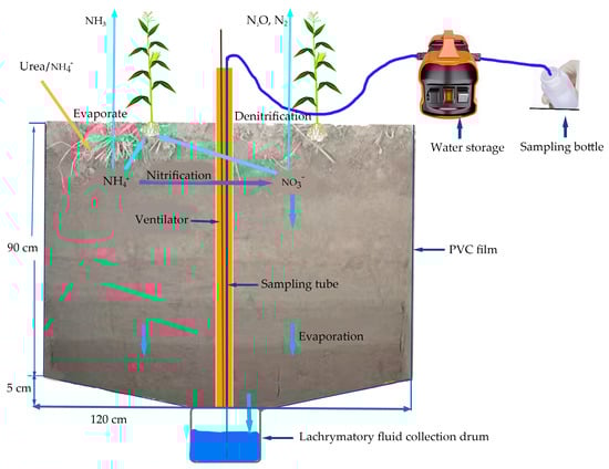 Due to less precipitation and extensive evaporation in the experimental area, leachate in soil with a depth of 90 cm was only collected after each irrigation event. The water samples were collected three times a year after two topdressing irrigation and winter irrigation, and the eluent in the liquid barrel was collected within 5~7 days after each irrigation event. The volume of the eluent was measured, and the mixed water samples were taken to determine total N, ammonium N (NH4+-N), and nitrate N (NO3−-N) concentrations. The TN concentration was digested by alkaline potassium persulfate and determined by ultraviolet spectrophotometry. The concentrations of NO3−-N and NH4+-N were determined by TRAC CS-2000 continuous flow analytical (CFA).