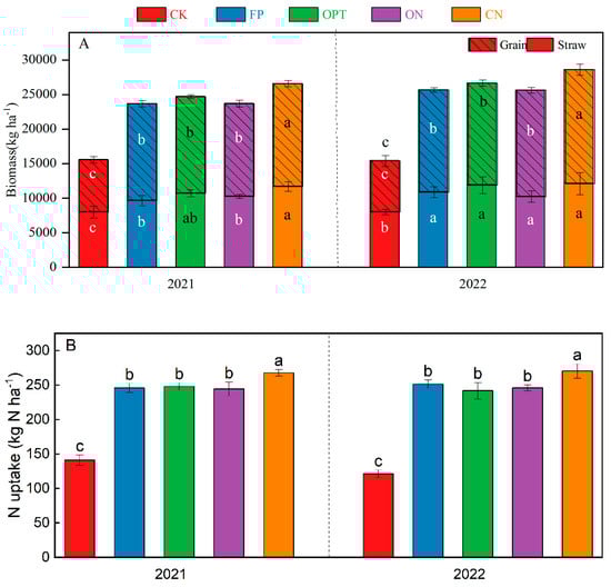 Above-ground biomass (A) and N uptake (B) of spring maize. Note: Additional lowercase letters represent significant differences (p < 0.05) in seed yield, straw biomass and N uptake under different N application strategies in the same period, and the error line represents the standard deviation.
