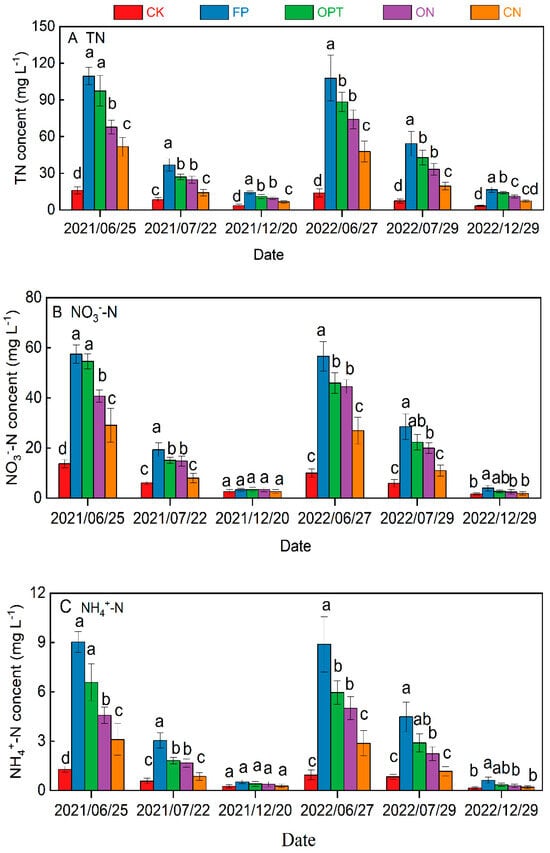 Concentration changes in TN (A), NO3−-N (B) and NH4+-N (C) in the leaching solution. Note: Additional lowercase letters represent significant differences (p < 0.05) in N leaching concentrations between different N application strategies during the same period, and the error line represents the standard deviation.
