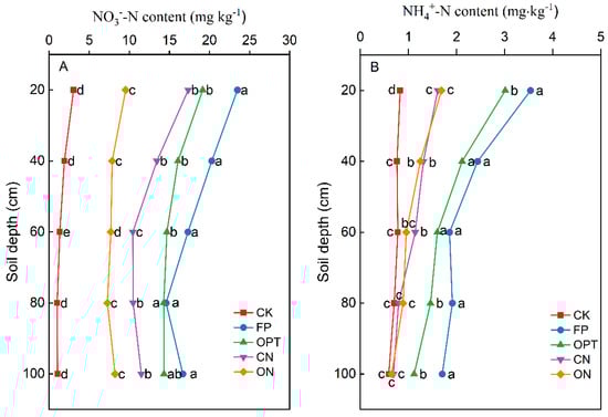 Meanwhile, ON significantly reduced residual inorganic N below 40 cm soil depth compared with FP and OPT treatments. In the 40–100 cm soil layer, the average NO3−-N content of ON treatment decreased by 32.24% and 25.14% compared with FP and OPT treatments. The NH4+-N contents in all treatments were low and decreased with the increase in soil depth. The NH4+-N contents in ON and CN treatments were approximately 50% lower than in FP and OPT treatments. Applying controlled-release N fertilizer and organic fertilizer significantly reduced the inorganic N percolation and reduced the residue of N fertilizer in the soil profile.