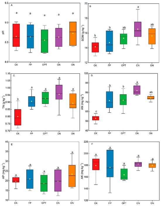 Differences in pH (A), organic matter content (B), total N content (C), alkali-hydrolyzable N content (D), available phosphorus content (E) and available potassium content (F) among different treatments. Note: Different lowercase letters after peer data indicate significant differences (p < 0.05).