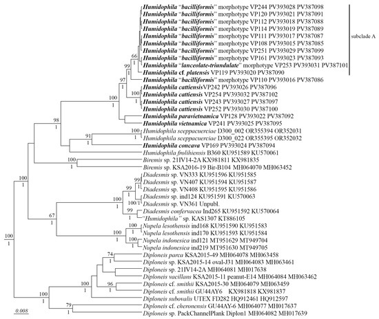 We have studied the morphological features of 18 Humidophila strains in detail and performed phylogenetic analysis on two marker regions, V4 18S rDNA and rbcL. These markers are the most commonly used for diatom phylogenetic analysis [34,35] and have the most data available in GenBank. The phylogenetic analysis shows that all Humidophila strains form a single monophyletic clade (Figure 1) with maximum support (BS 98, PP 1.0). Within the clade, some distinct branches corresponding to different species are clearly distinguished (Figure 1). Based on the analysis of morphology and molecular data, we identify four species new to science—H. cattiensis sp. nov., H. vietnamica sp. nov., H. paravietnamica sp. nov., and H. concava sp. nov. These species have clear morphological differences and represent separate phylogenetic lineages.