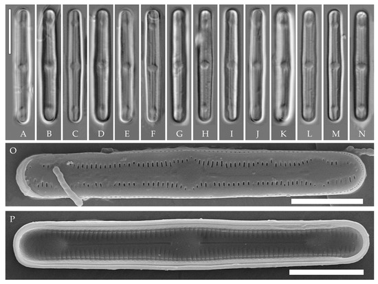 Humidophila vietnamica sp. nov. Strain VP241, slide 06999. (A–N) Light microscopy, differential interference contrast. (E) Holotype. Scale bar of 10 μm. (O,P) Scanning electron microscopy. (O) Whole valve, external view. (P) Whole valve, internal view. Scale bar of 5 μm.