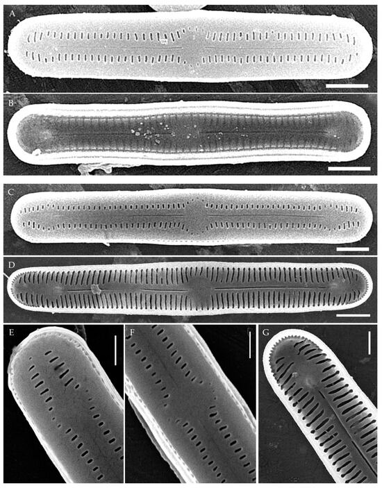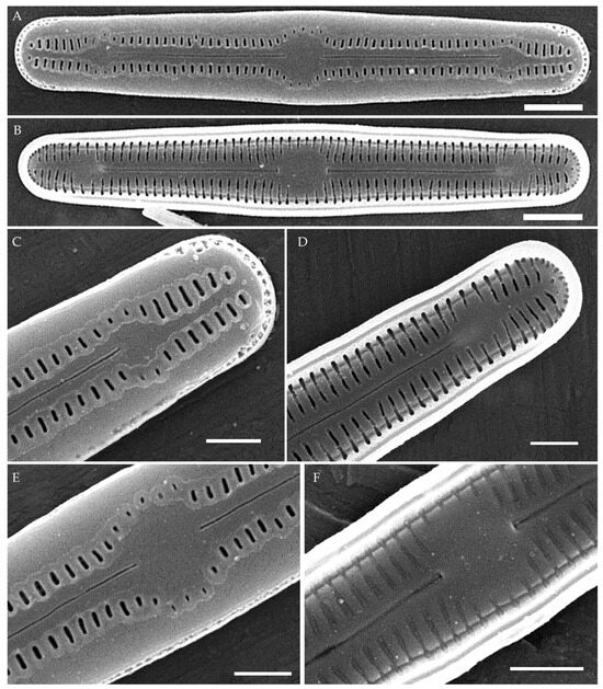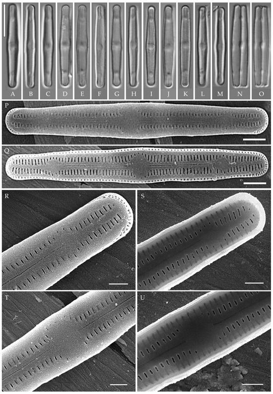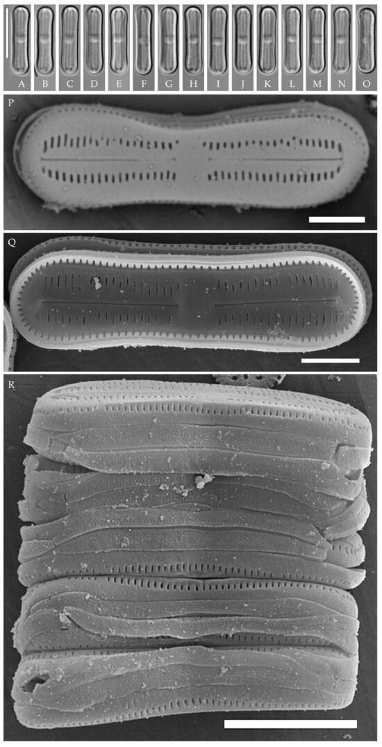 SEM (Figure 7P–R). Externally, striae are parallel throughout the valve (Figure 7P), composed of transapically elongated or slit-like areolae (40–45 in 10 μm). In the central area, areolae can be absent (fascia), or rounded areolae may be present on only one side (Figure 7P). Raphe is straight and filiform, with simple or T-shaped central endings (Figure 7P). Terminal raphe endings are simple, connected with the last areolae by shallow grooves. Mantle areolae continue around the valve apices, without any interruption (Figure 7P,Q). Girdle bands are open, with one row of rounded poroids (Figure 7R). Cells form ribbon-like colonies (Figure 7R).