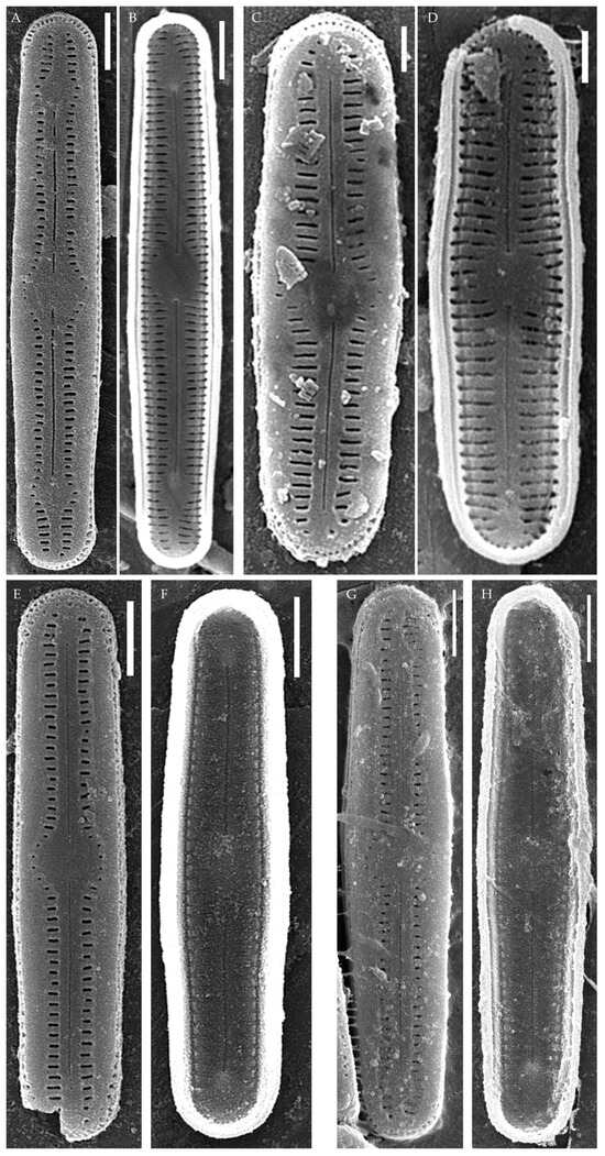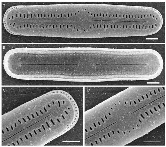 SEM (Figure 5O,P). Externally, striae parallel throughout the valve or slightly radiate at the valve center (Figure 5O), composed of short transapically elongated or nearly rounded areolae (36 in 10 μm), with the areolae elongated at the apices, located in a longitudinal depression (Figure 5O). Raphe is straight, filiform, with simple, straight central and terminal endings. The terminal endings do not extend to the edge of the valve and terminate near the axial hyaline area. Striae terminate near the valve apex. Mantle areolae are continuous at the valve apices (Figure 5O).