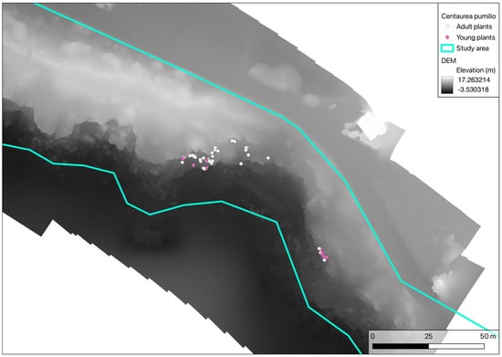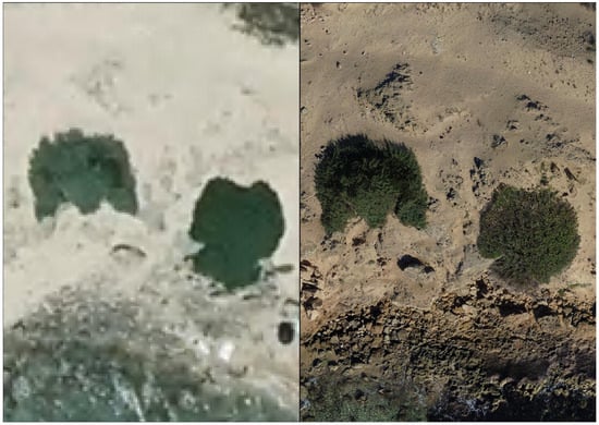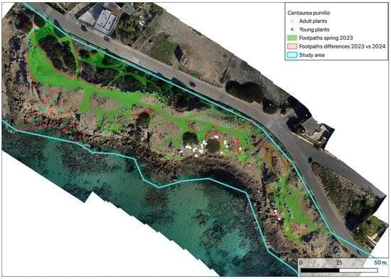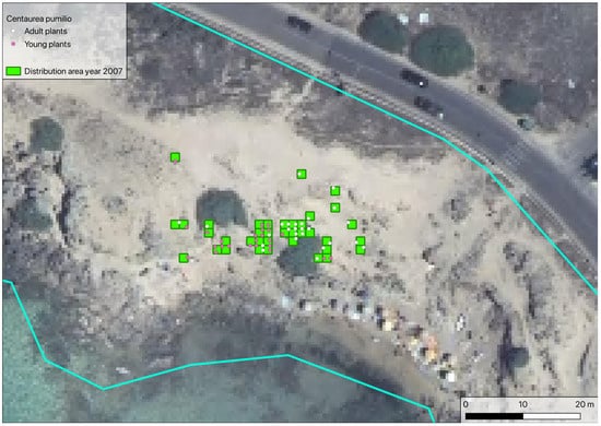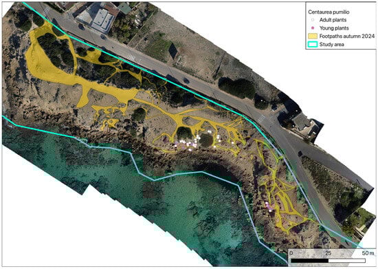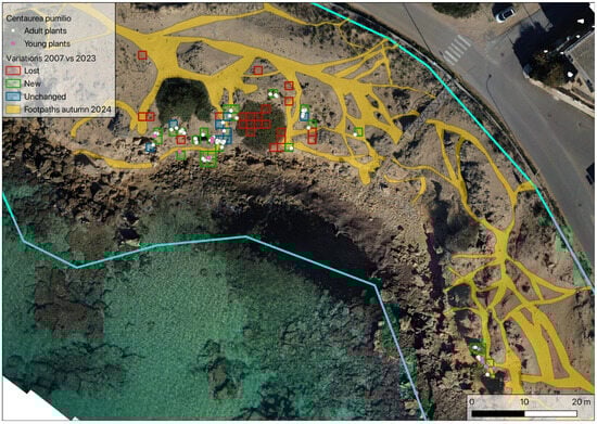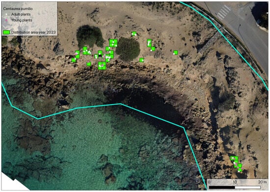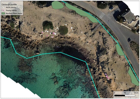 - Establishment of Nursery Plant Areas (NPAs), to promote the survival and dissemination of the species. In this case, macro-areas within which to sow Centaurea pumilio were identified. Areas not frequented by beachgoers, at a greater height above sea level than the existing population, were chosen (Figure 10). The latter condition will promote the rolling of the seeds towards the aforementioned areas with a view to increasing population density [12].