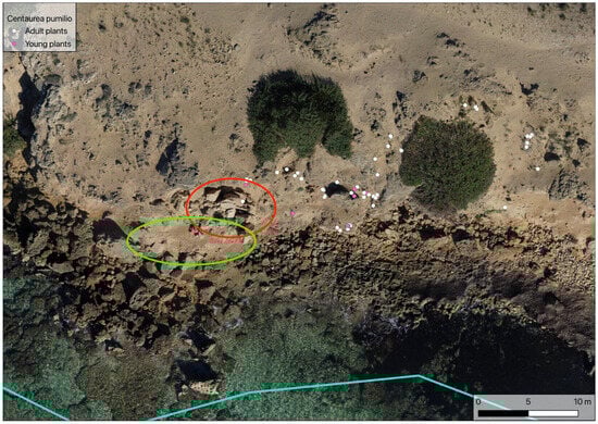 - Identification of portions of the beach that are naturally inaccessible to beachgoers or can be closed off by positioning stone blocks; the sowing of Centaurea pumilio in these areas to allow the growth of seedlings under less anthropic pressure. A suitable area has already been identified (Figure 9, green circle), characterised by interruption of the coastline by fallen rocks (Figure 9, red circle);