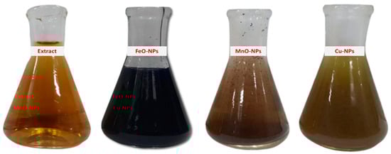 Color indication of biosynthesized iron oxide, manganese oxide, and copper nanoparticles.