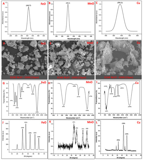 Characterization of iron oxide nanoparticles via (A) UV-visible spectroscopy, (D) scanning electron microscopy, (G) Fourier transform infrared (FTIR) spectroscopy, and (J) X-ray diffraction (XRD); manganese oxide nanoparticles via (B) UV-visible spectroscopy, (E) scanning electron microscopy, (H) FTIR spectroscopy, and (K) X-ray diffraction; and copper nanoparticles via (C) UV-visible spectroscopy, (F) scanning electron microscopy, (I) FTIR spectroscopy, and (L) X-ray diffraction.