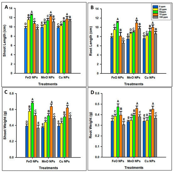 Optimization of different concentrations of iron oxide, manganese oxide, and copper nanoparticles by estimating (A) shoot length, (B) root length, (C) shoot weight, and (D) root weight of Zea mays L. crop. The data are the mean of three replications (n = 3) with ± standard deviations. Different letters above the bars indicate significance differences (p ≤ 0.05) among means according to Fisher’s LSD.