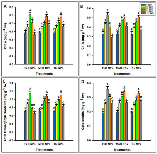 The application of FeO NPs significantly increased the chlorophyll and carotenoid contents at 50 ppm concentration and then decreased them, as shown in Figure 4A–D. The maximum chlorophyll a (0.6073 mg g−1 fw), b (0.5307 mg g−1 fw), total chlorophyll content (1.1380 mg g−1 fw), and carotenoids (0.3570 mg g−1 fw) were observed at 50 ppm concentration, whereas the minimum chlorophyll a (0.3637 mg g−1 fw), b (0.2920 mg g−1 fw), and total chlorophyll content (0.6557 mg g−1 fw) were observed at 100 ppm concentration and for carotenoids (0.1920 mg g−1 fw) at 0 ppm concentration. Moreover, the application of MnO NPs improved the chlorophyll a, b, total chlorophyll, and carotenoids at 75 ppm concentration, followed by 50 ppm concentration, and the minimum (0.3860, 0.3263, 0.7123, 0.1960 mg g−1 fw) was observed at 0 ppm concentration. Similarly, the application of Cu NPs significantly improved the photosynthetic pigment content at 75 ppm concentration and then decreased. The maximum chlorophyll a (0.5793 mg g−1 fw), b (0.5080 mg g−1 fw), total chlorophyll (0.1.0873 mg g−1 fw), and carotenoids (0.3287 mg g−1 fw) were observed at 75 ppm concentration. Minimum chlorophyll a (0.3843 mg g−1 fw), b (0.3230 mg g−1 fw), total chlorophyll (0.7073 mg g−1 fw), and carotenoids (0.1940 mg g−1 fw) contents were observed at 0 ppm. Overall, FeO NPs demonstrated a phytotoxic threshold of 50 ppm, whereas MnO NPs and Cu NPs presented a higher threshold of 75 ppm.