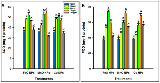 The application of FeO NPs significantly increased the SOD and POD activities at 50 ppm concentration but decreased them at other concentrations (Figure 5). The maximum concentrations of SOD (52.2 mg−1) and POD (74.14 mg−1) were observed at 50 ppm, and the minimum concentration (37.82 and 37.70 mg−1) were observed at 0 ppm. Additionally, the application of MnO NPs improved the SOD (53.94 mg−1 protein) and POD (71.98 mg−1 protein) at 75 ppm concentration, followed by 50 ppm. The minimum SOD activity (31.42 mg−1 protein) was observed at 100 ppm, and the minimum POD activity (38.16 mg−1 protein) was observed at 0 ppm concentration. However, the application of Cu NPs significantly improved the SOD (50.57 mg−1) and POD (68.66 mg−1) contents at 75 ppm concentration, which then decreased. The minimum SOD (34.61 mg−1 protein) was observed at 100 ppm concentration, and the POD activity (38.36 mg−1 protein) was lowest at 0 ppm concentration. Overall, FeO NPs demonstrated a phytotoxic threshold of 50 ppm, whereas MnO NPs and Cu NPs presented a higher threshold of 75 ppm.