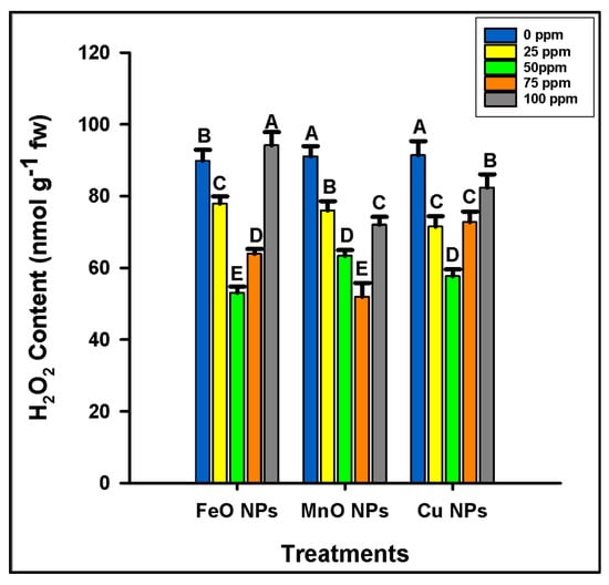 The application of FeO NPs significantly decreased hydrogen peroxide (H2O2) stress at 50 ppm concentration. The maximum H2O2 stress (94.12 nmol g−1 fw) was observed at 100 ppm concentration (Figure 6). The minimum H2O2 stress was observed (53.03 nmol g−1 fw) at 50 ppm concentration. In the case of MnO NPs, the maximum H2O2 stress was observed (91.33 nmol g−1 fw) at 0 ppm concentration, and the minimum H2O2 stress (57.64 nmol g−1 fw) was observed at 50 ppm concentration. Similarly, Cu NPs application significantly reduced the H2O2 stress at 75 ppm concentration. The maximum H2O2 stress was observed (91.33 nmol g−1 fw) at 0 ppm concentration and minimum (57.64 nmol g−1 fw) at 50 ppm concentration. The oxidative stress parameter confirmed the phytotoxic threshold of FeO NPs at 50 ppm, whereas the phytotoxic threshold of MnO and Cu NPs was 75 ppm (Figure 6).
