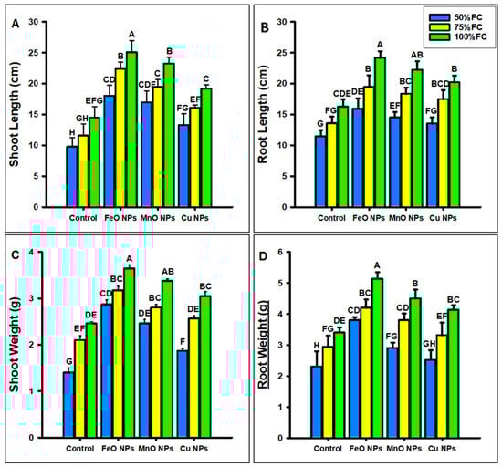 Effect of foliar application of different concentrations of iron oxide, manganese oxide, and copper nanoparticles against drought stress on (A) shoot length, (B) root length, (C) shoot weight, and (D) root weight in Zea mays L. crop. The data are the mean of three replications (n = 3) with ± standard deviations. Different letters above the bars indicate the significant differences (p ≤ 0.05) among means according to Fisher’s LSD.