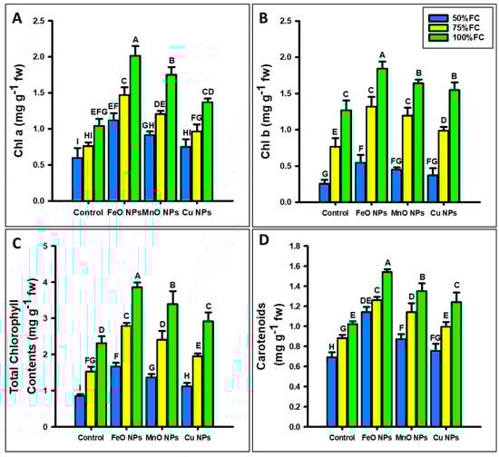 Foliar application of FeO, MnO, and Cu NPs significantly improved the photosynthetic content (Figure 8) of maize under different levels of drought stress (50%, 75%, and 100% FC). At 50% FC, FeO NPs increased the photosynthetic content (chl a, b, total chlorophyll, and carotenoids) by 46%, 53%, 48%, and 44%; MnO NPs by 34%, 43%, 37% and 31%, and Cu NPs by 20%, 31%, 23% and 22% at 50%, respectively, under drought stress. At 75% FC, FeO NPs increased the chlorophyll content parameters (chl a, b, total chlorophyll, and carotenoids) by 48%, 42%, 45%, and 42%; MnO NPs by 37%, 36%, 46%, and 31%; and Cu NPs by 21%, 22%, 21%, and 23%, respectively. At 100% FC, the FeO NPs increased the chlorophyll content parameters (chl a, b, total chlorophyll, and carotenoids) by 48%, 31%, 40%, and 40%; the MnO NPs increased the chlorophyll content by 40%, 22%, 31%, and 30%; and the Cu NPs increased the chlorophyll contents by 23%, 17%, 20%, and 21%, respectively, at different levels of drought stress. FeO NPs showed the best results, followed by MnO and Cu nanoparticles.