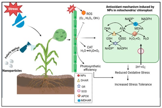 Schematic representation of the antioxidant mechanism induced by nanoparticles in maize under drought stress. This figure was created with BioRender.com.
